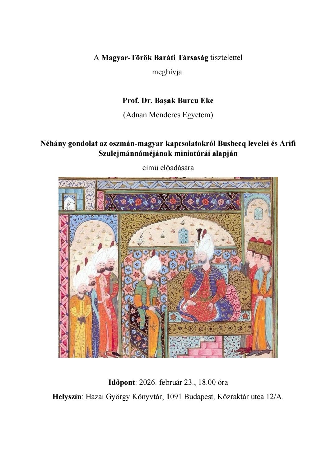 NÉHÁNY GONDOLAT AZ OSZMÁN – MAGYAR KAPCSOLATOKRÓL 2026. febr 18. Esemény részletek Date: 2026. febr 23. 18:00 – 20:00 Kategóriák: Budapesti rendezvény Címkék: oszmán - magyar kapcsolat Kép forrása: facebook