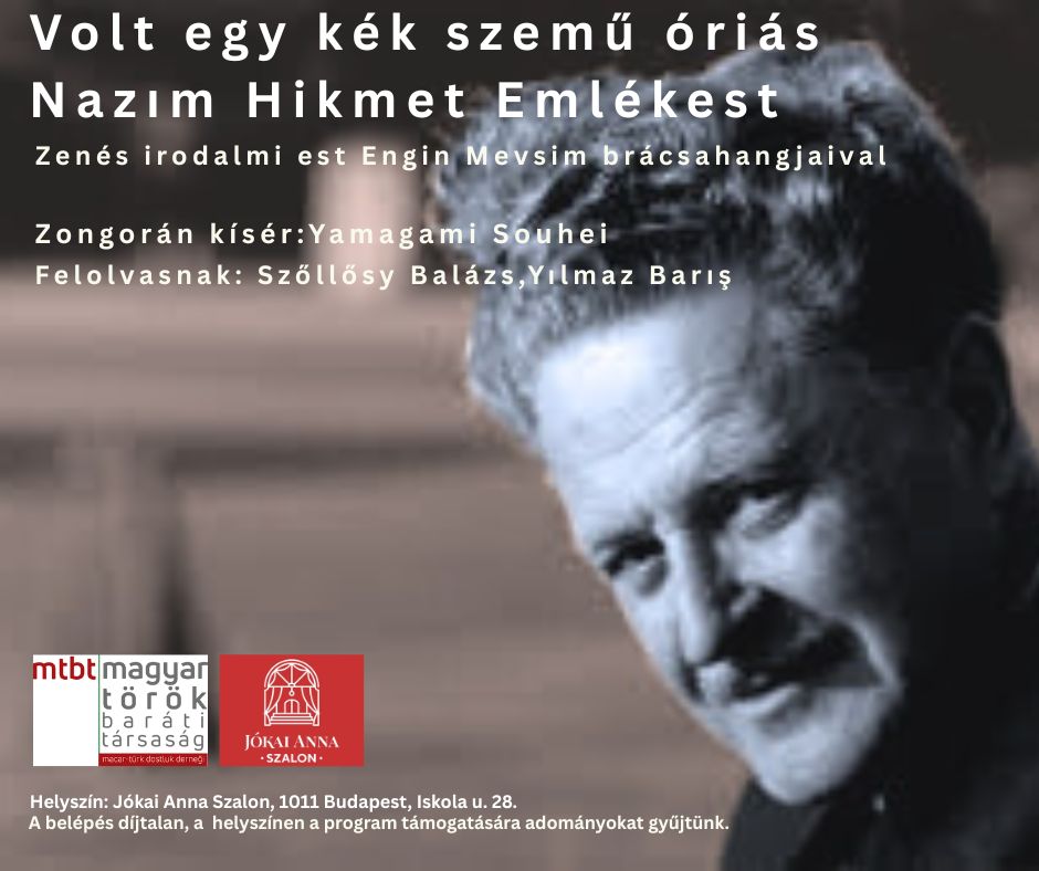 Büyük Türk şairi Nazım Hikmet’i doğum gününde, müzik ve şiirle anıyoruz. Şairin eserleri, gerek eski gerekse yeni nitelikli çeviriler sayesinde son yıllarda giderek daha geniş bir okur kitlesi tarafından yeniden keşfedilmektedir. Etkinlik kapsamında edebiyatçı Dr. Barış Yılmaz ile Macar-Türk Dostluk Derneği Başkan Yardımcısı Balázs Szőllőssy, Nazım Hikmet’in yaşamını ve edebi mirasını tanıtacak; ardından Mevsim Engin’in (viyola) ve Yamagami Souhei’nin (piyano) müzikleriyle eşliğinde, şiirleri Türkçe ve Macarca olarak seslendirilecektir. Gelenekselleşmesi planlanan etkinliğin amacı, müzik eşliğinde Türk şairlerini tanıtmayı hedefleyen bir etkinlikler dizisinin ilk adımını atmaktır. Gelin, yirminci yüzyılın en önemli Türk şairlerinden birinin eserleriyle yeni yılı hep birlikte karşılayalım.