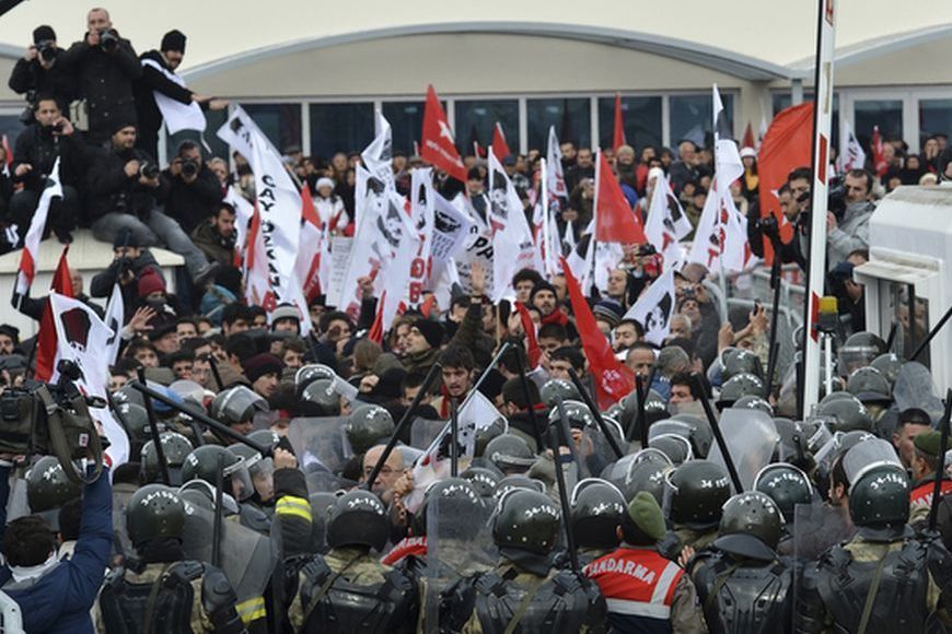 Protesters are blocked by Turkish soldiers as they try to march to a court house near Istanbul